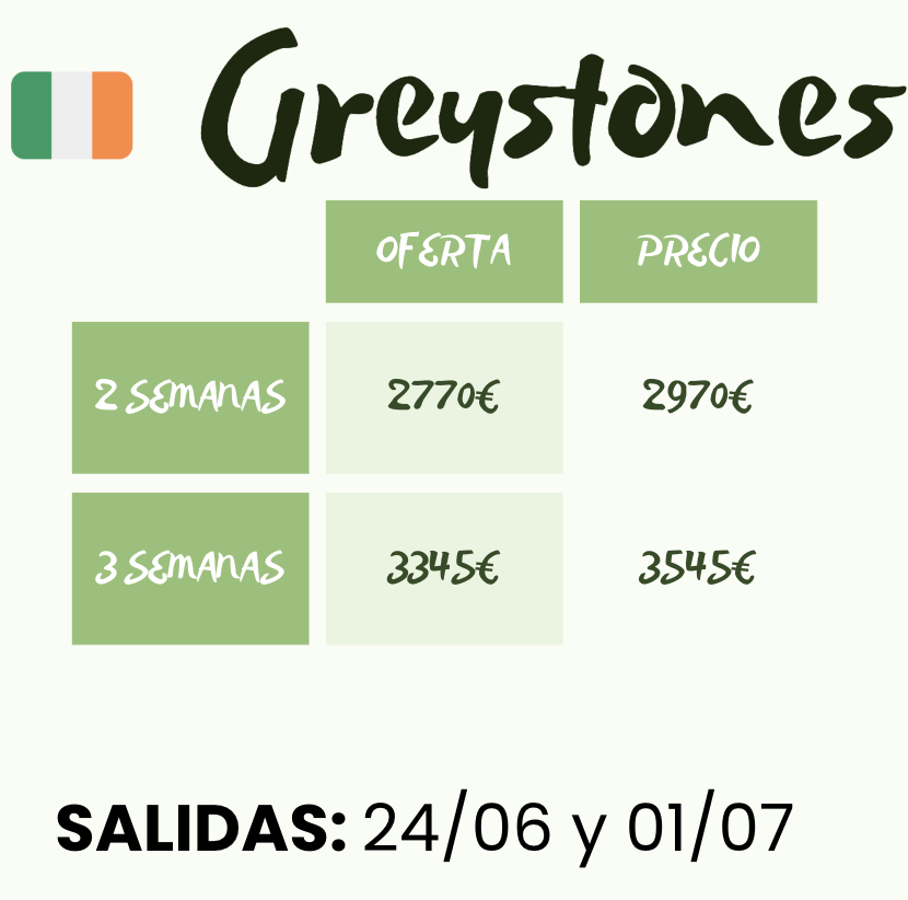 Greystones presenta este año un programa renovado que combina cultura irlandesa y diversión a cada paso. Los alumnos aprenderán a tocar la flauta tradicional, probarán deportes irlandeses llenos de energía y disfrutarán de rutas de senderismo por paisajes espectaculares.