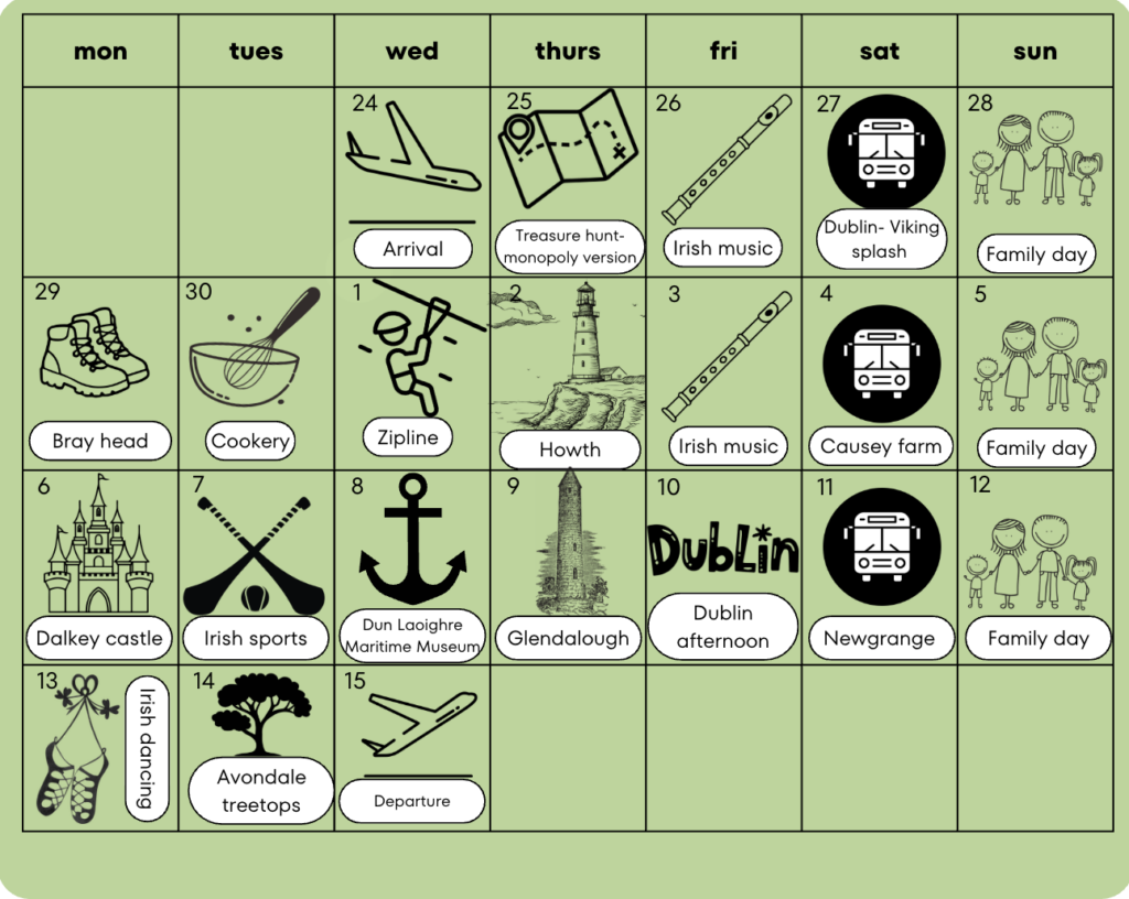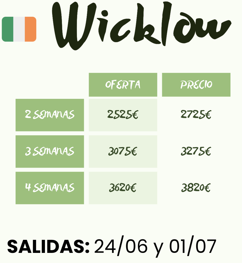Incluye: Traslados desde las estaciones de autobuses de Zaragoza y Valladolid al aeropuerto ida y vuelta (si hay grupo mínimo), vuelos ida y vuelta, traslados en Irlanda, monitor acompañante 24/7, alojamiento de un único estudiante de habla hispana por familia en régimen en pensión completa (con la opción de compartir host family), clases, actividades y excursiones, seguro de viaje y mochila VenaIrlanda.es.