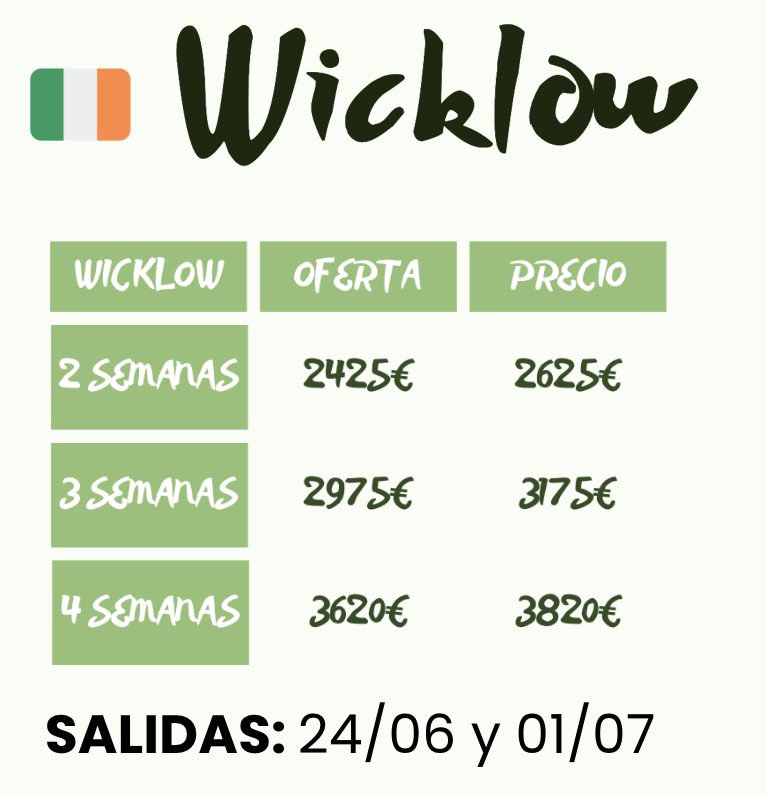 Incluye: Traslados desde las estaciones de autobuses de Zaragoza y Valladolid al aeropuerto ida y vuelta (si hay grupo mínimo), vuelos ida y vuelta, traslados en Irlanda, monitor acompañante 24/7, alojamiento de un único estudiante de habla hispana por familia en régimen en pensión completa (con la opción de compartir host family), clases, actividades y excursiones, seguro de viaje y mochila VenaIrlanda.e